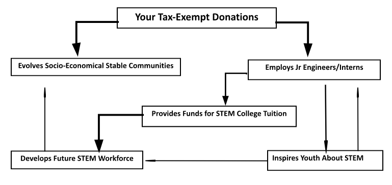 We accept donations, and sponsorships. Your donations goes towards the hiring of, local area youth, in pursuit of STEM majors, as Jr Engineers. Your sponsorships help make STEM accessible, and available to youth who are in financial need.